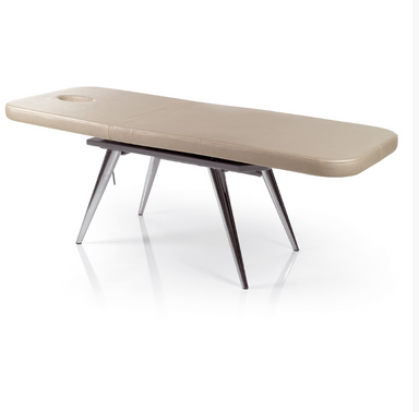 Rectangular massage table with electric bed height adjustment and manual adjustment of the backrest position.